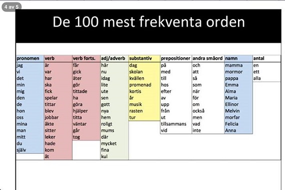 Jos sinua kiinnostaa, mitkä ovat äidinkielesi 100 tavallisinta sanaa, googlaa se. Tässä sivussa on esimerkki ruotsin kielen päiväkoti-ikäisten lasten tavallisimista sanoista, nimineen. Oli ydinsanasto 100 tai 500 sanaa, on siitä hyvä lähteä liikkeelle kaikessa kielen opetuksessa, vieraankin kielen opetuksessa.
